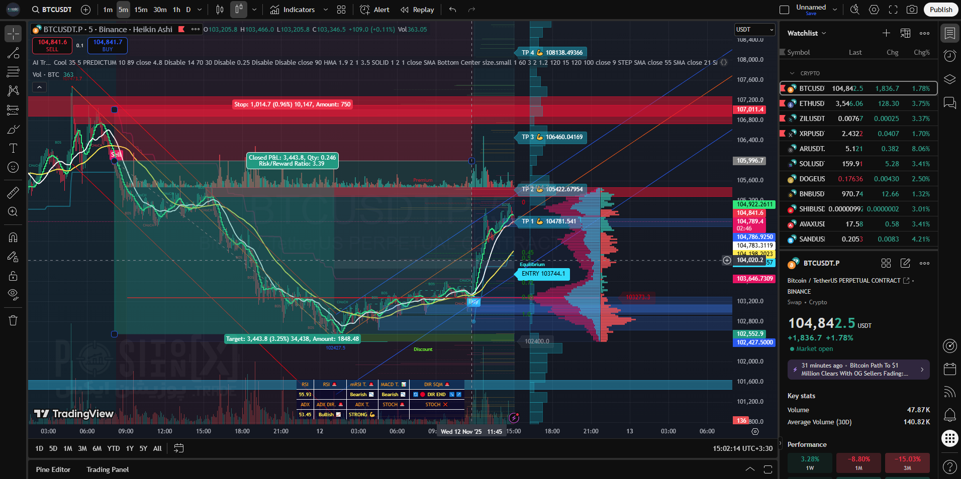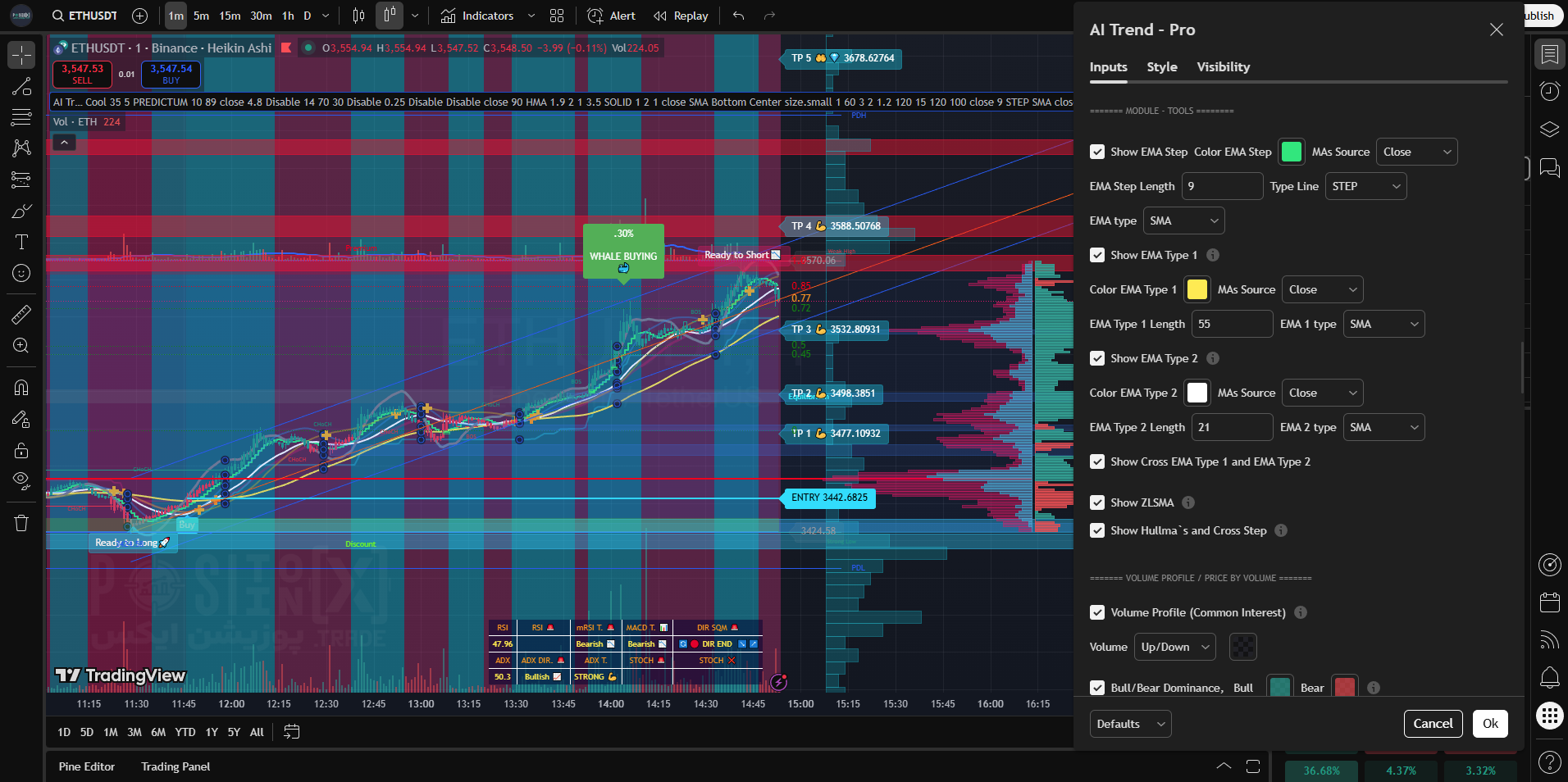 سیستم چندفیلتری (Confluence): ترکیب SuperTrend با RSI، EMA و Whale Filter.