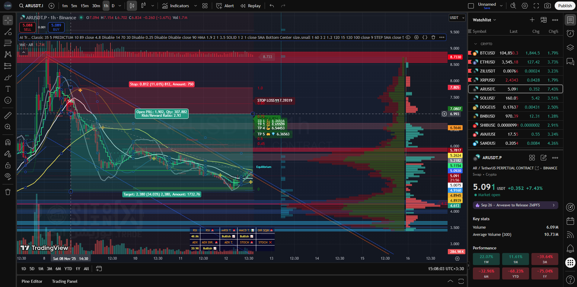 PREDICTUM یک الگوریتم اختصاصی است که هدفهای سود را به صورت تصاعدی و با استفاده از نسبت طلایی (0.618) مقیاسبندی میکند تا سود معاملات قوی را به حداکثر برساند.