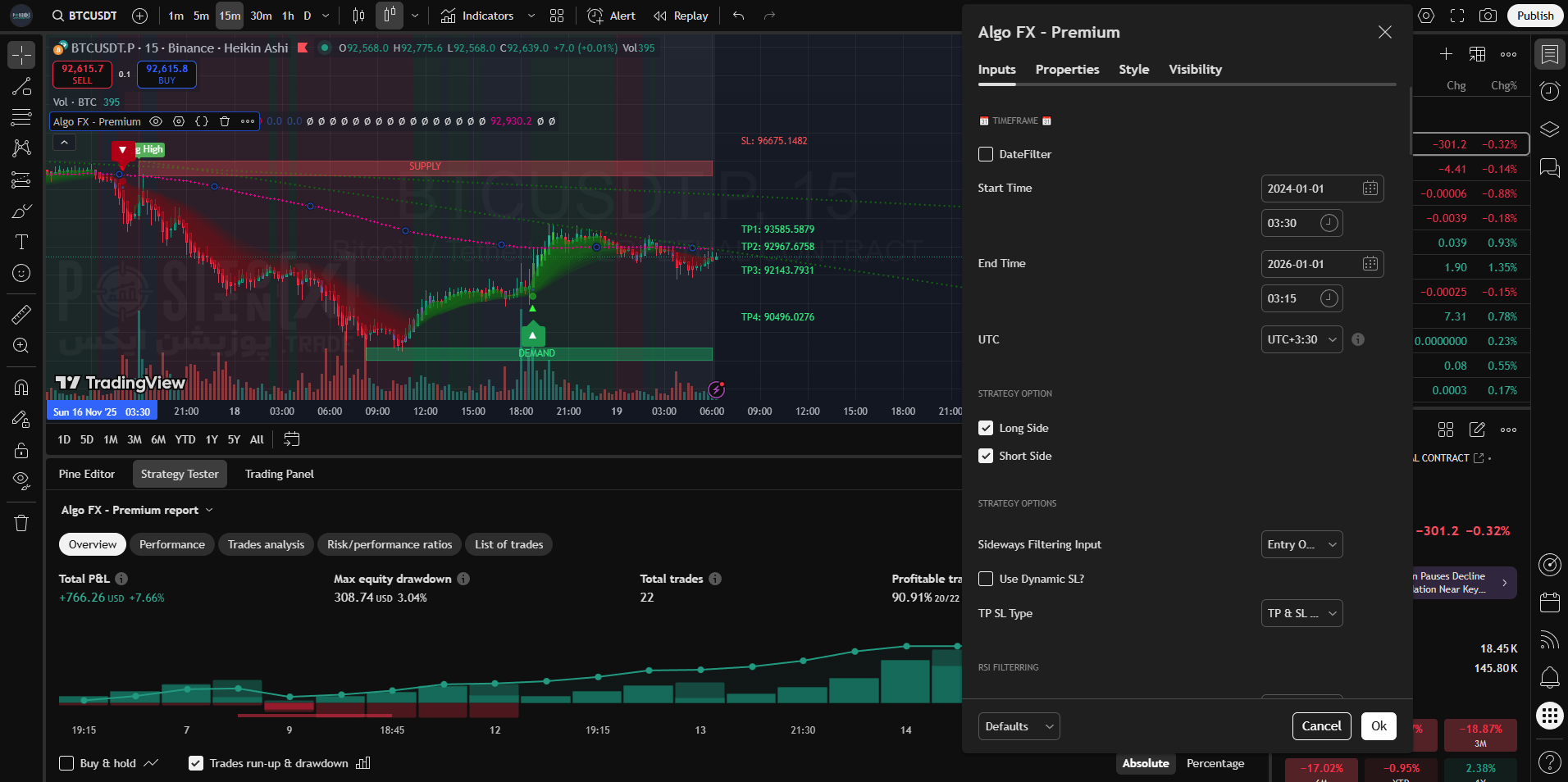 استراتژی Algo FX Premium یک استراتژی جامع تریدینگ ویو است که بر پایه Supertrend Strategy ساخته شده و با فیلترهای پیشرفته ATR Filter و RSI Filtering تقویت شده است. این اسکریپت نه تنها سیگنال‌های Moving Average Crossover را شناسایی می‌کند، بلکه RSI Divergence را برای تشخیص وارونگی‌های بازار استفاده می‌نماید. نوآوری اصلی آن در ترکیب فیلترینگ دوگانه (ATR یا RSI) برای ورود تنها در بازارهای Sideways یا خنثی است، که ریسک را کاهش می‌دهد و وین‌ریت (winrate) را افزایش می‌دهد. با پشتیبانی از Backtesting Strategy داخلی، می‌توانید عملکرد را در داده‌های تاریخی مختلف تست کنید و تنظیمات را بهینه‌سازی نمایید. این محصول برای تریدرهایی طراحی شده که می‌خواهند از تحلیل Multi-Timeframe Analysis برای تصمیم‌گیری‌های آگاهانه استفاده کنند.