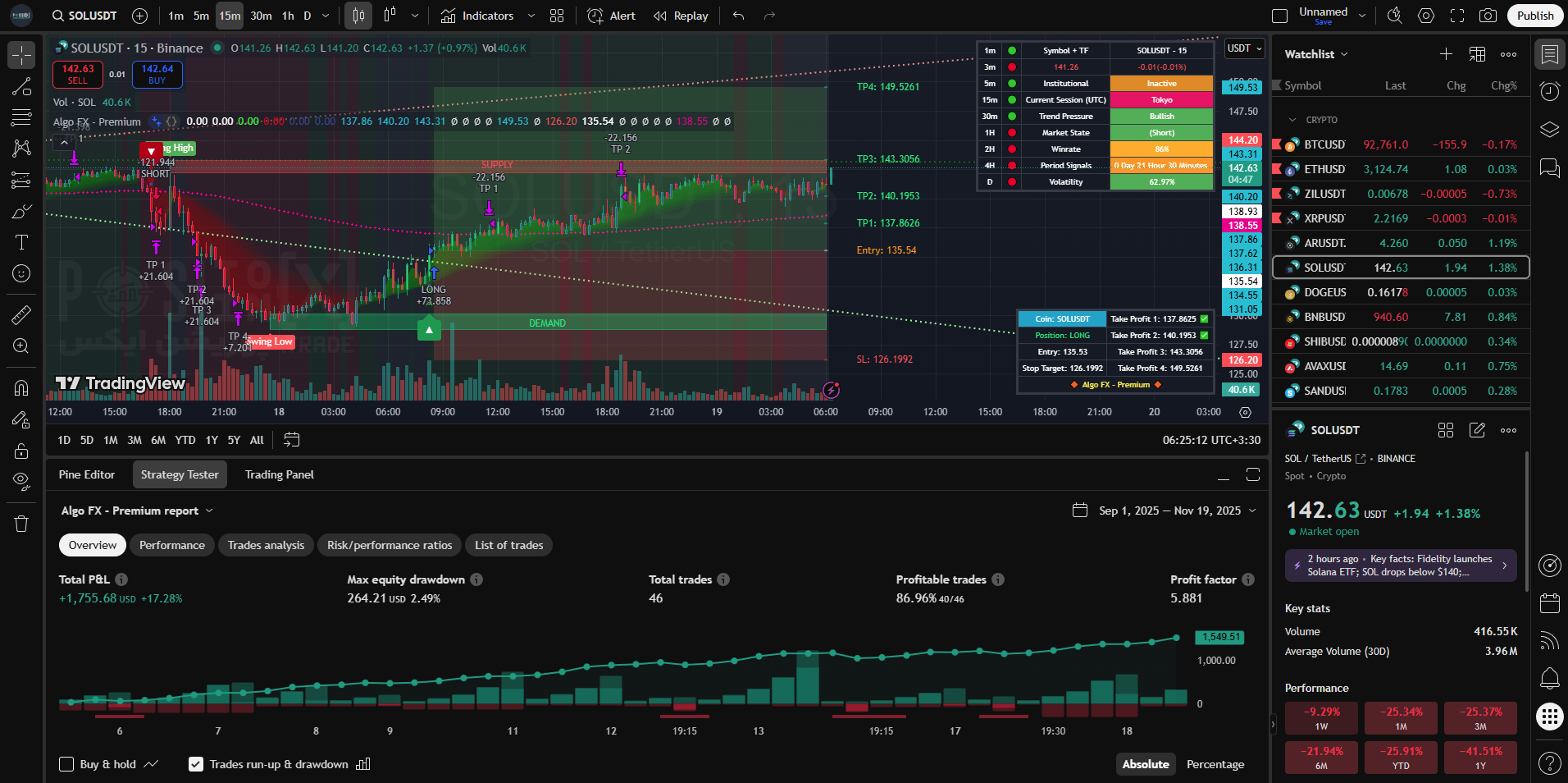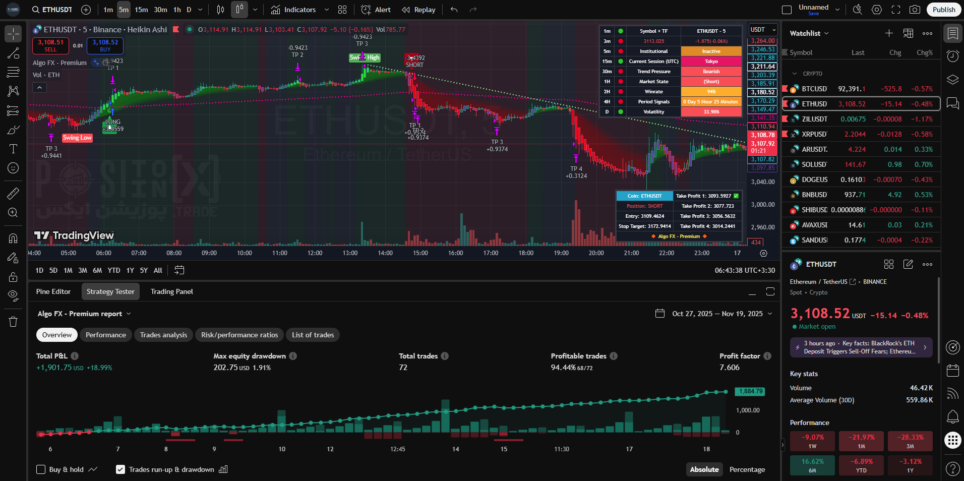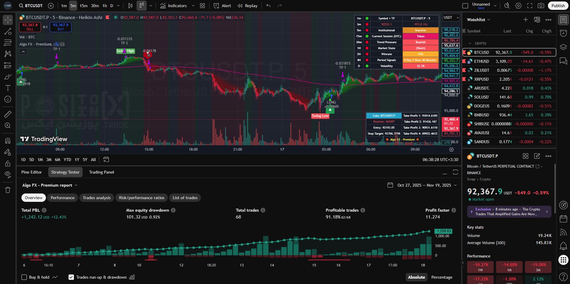 • بازار کریپتو (Crypto Trading): ایده‌آل برای معاملات فیوچرز (Futures) با اهرم‌های بالا (مانند BTCUSDT.P و ETHUSDT.P) ، به دلیل توانایی بالا در مدیریت ریسک با SL/TP دینامیک بر اساس ATR.