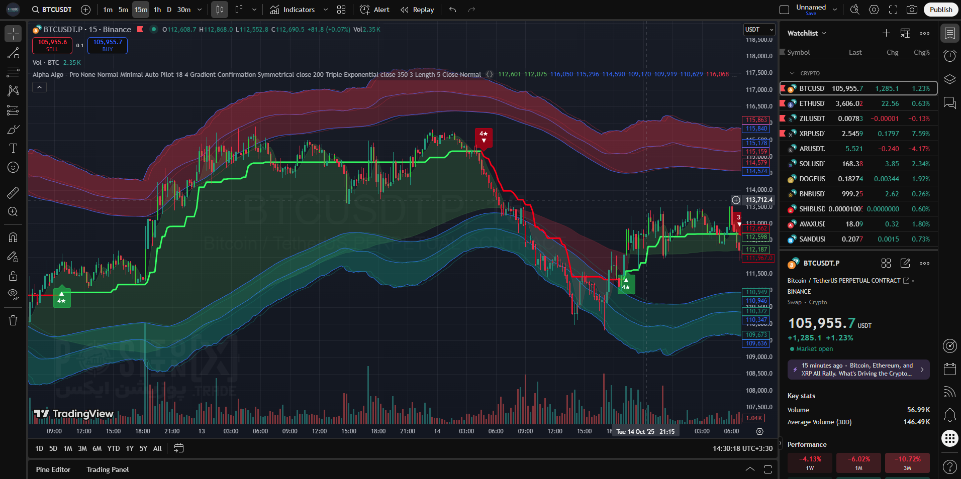 اندیکاتور آلفا الگو v1 Pro نسخه 1 یک اندیکاتور Pine Script نسخه 6 است، این اسکریپت با ترکیب محاسبات پیشرفته نوسانات تاریخی (Historical Volatility Calculator) و میانگینهای متحرک سفارشی مانند Ehlers Kaufman Moving Average Crossover، سیگنال های خرید و فروش دقیق (Buy Sell Signals) تولید میکند. نوآوری اصلی آن در ادغام ابرهای معکوس (Reversal Cloud Indicator) با ردیاب روند (Trend Tracer Strategy) و رنگآمیزی گرادیان شمعها (Candle Coloring Gradient) است که تریدینگ را ساده و سودآور میکند.