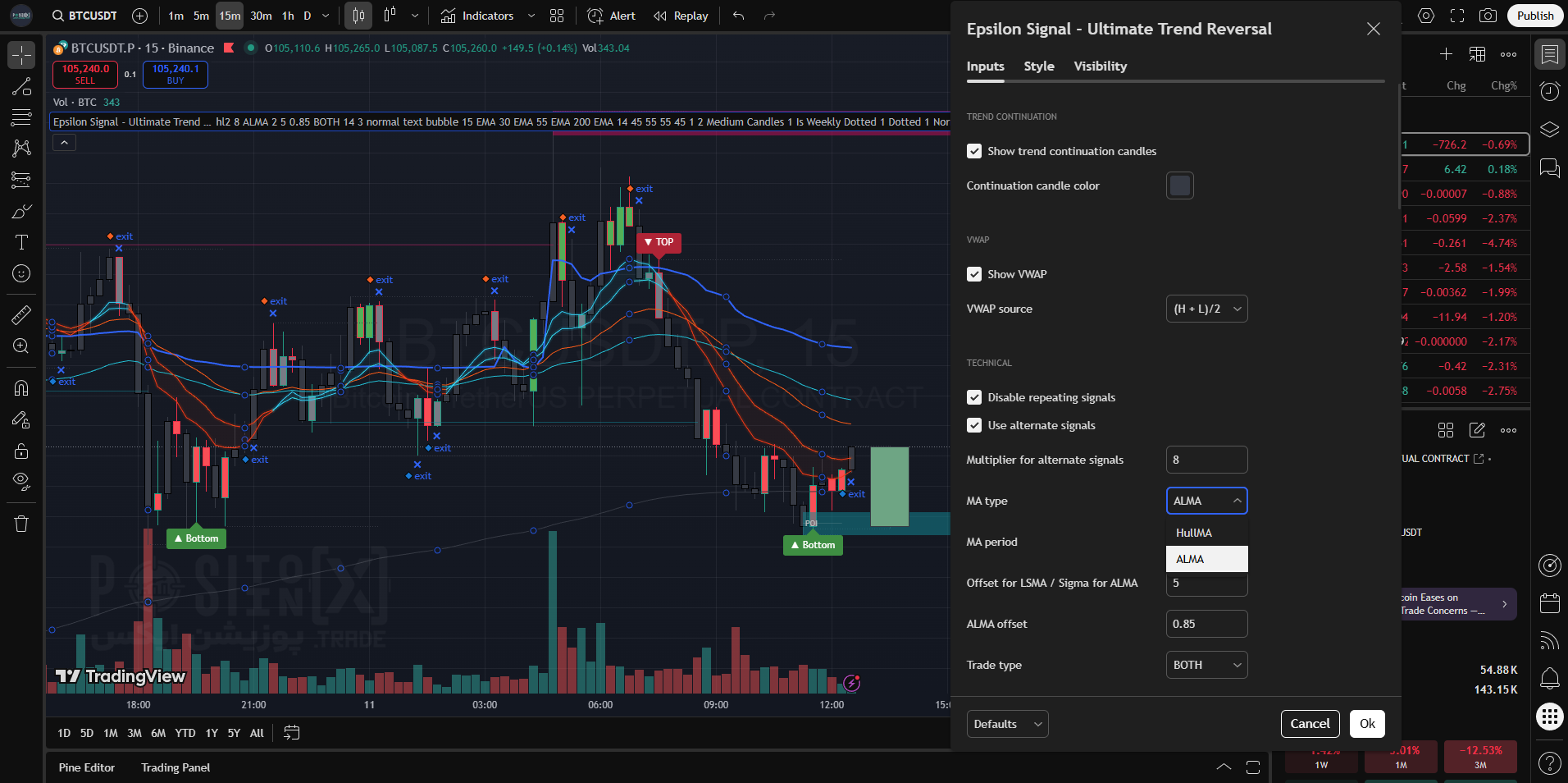 محاسبات پیشرفته ALMA و HullMA: استفاده از میانگین متحرک آرنو لگوکس یا ALMA (Arnaud Legoux Moving Average) برای کاهش نویز و تاخیر در اندیکاتور سیگنال ها، به همراه HullMA برای شناسایی سریع چرخشهای قیمت.