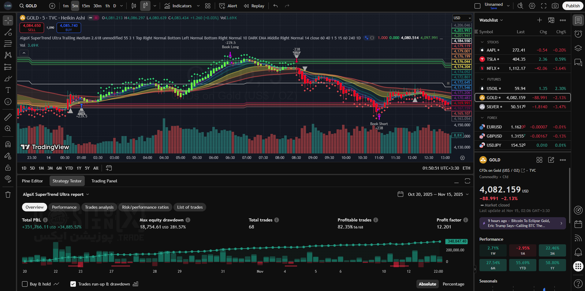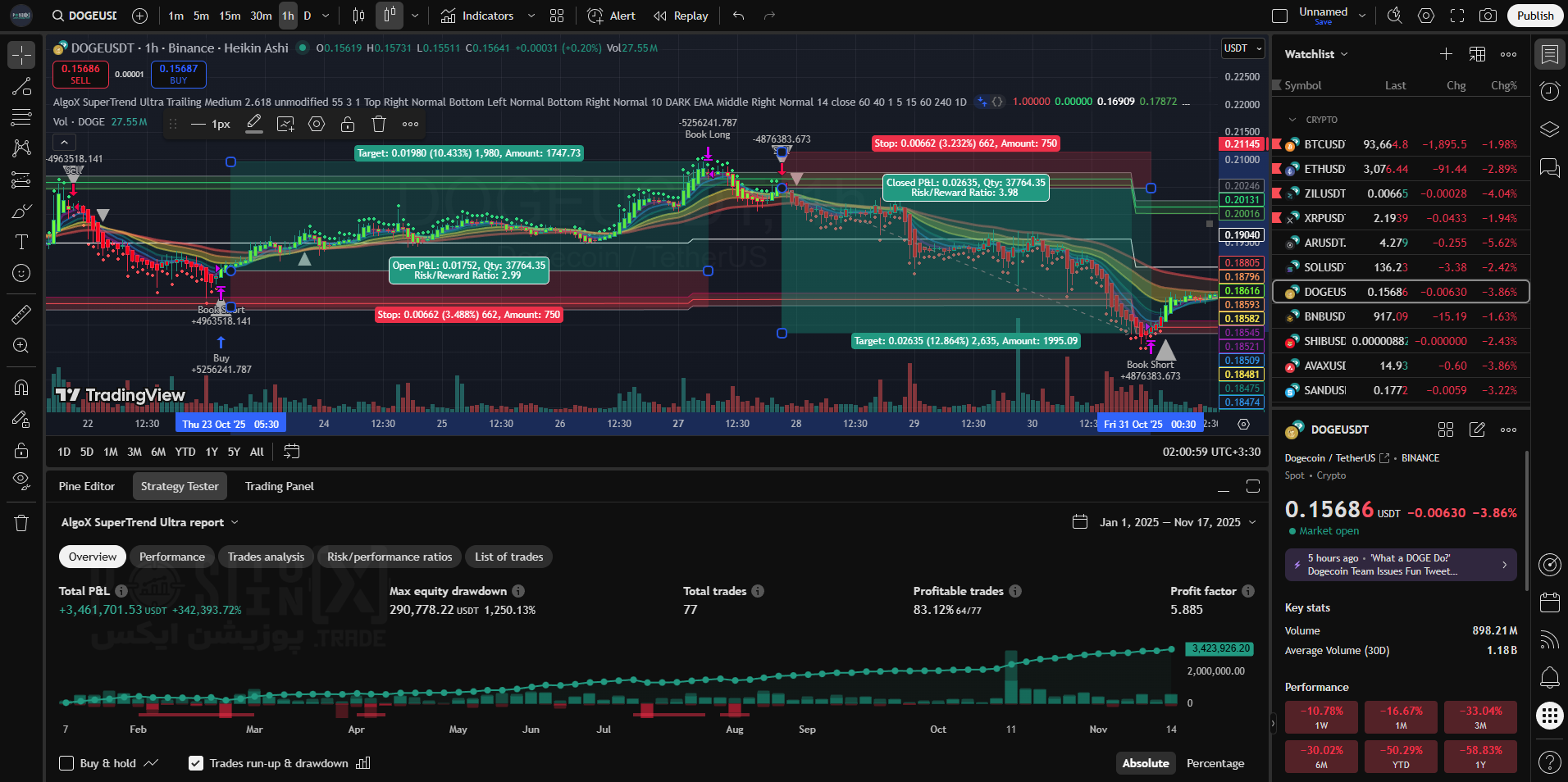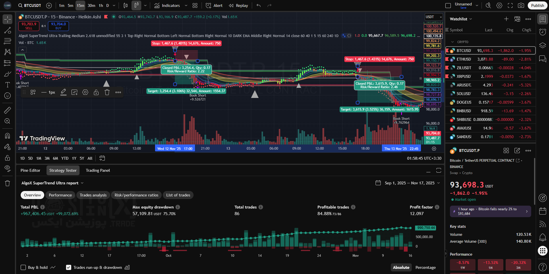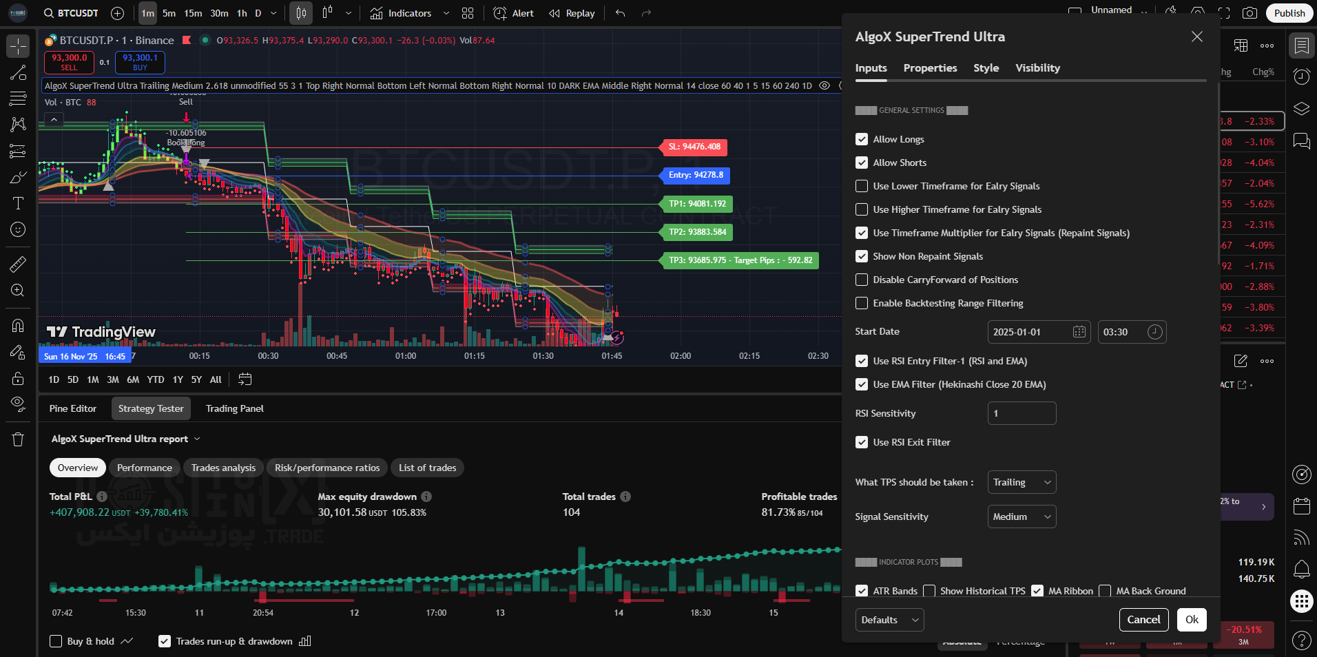 استراتژی SuperTrend Ultra – AlgoX صرفاً یک اندیکاتور ساده نیست؛ بلکه یک اکوسیستم معاملاتی هوشمند در پلتفرم تریدینگویو است. این اسکریپت همانطور که گفته شد با بازنگری عمیق در الگوریتم کلاسیک استراتژی سوپرترند و ترکیب آن با الگوریتمهای پیشرفته فیلترینگ نوسان، طراحی شده تا به تریدرها کمک کند در تلاطمهای بازار، جهت اصلی روند را با کمترین خطا تشخیص دهند. برخلاف نسخههای رایگان و معمولی، این نسخه بر پایه محاسبات دقیق ATR (میانگین محدوده واقعی) و تاییدیه نوساننماهای چندزمانه بنا شده است.