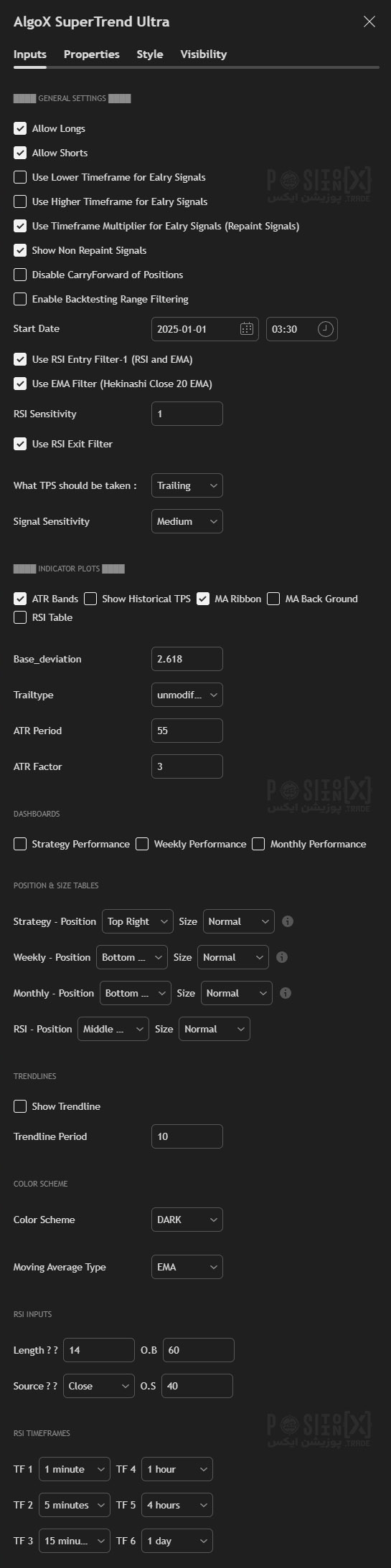 فرقی نمیکند که یک معاملهگر اسکالپر (Scalper) در بازار فارکس هستید یا یک سرمایهگذار بلندمدت در بازار کریپتو و سهام، منطق داینامیک استراتژی الگو ایکس – SuperTrend Ultra خود را با فراکتال های (Fractal) مختلف قیمتی تطبیق میدهد. این اسکریپت با قابلیت سفارشیسازی کامل پارامترها، به شما اجازه میدهد تا استراتژی را دقیقاً مطابق با روانشناسی معاملات خود و ویژگیهای نماد مورد نظرتان بهینه سازی کنید. همچنین در صورت نیاز به راهنمایی های بیشتر در خصوص تغییرات مد نظر خود می توانید با پشتیبانی مختصص پوزیشن ایکس ما در ارتباط باشید.